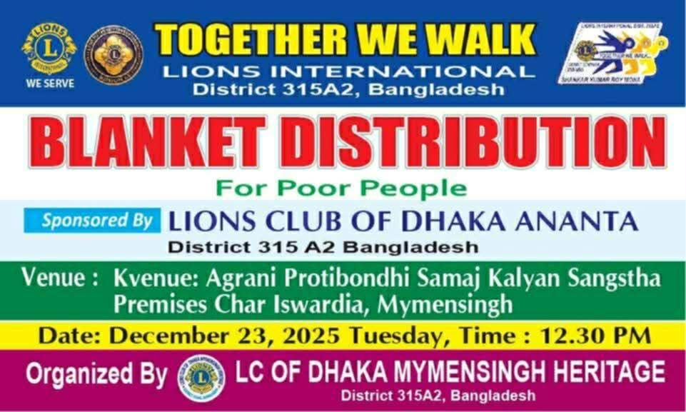 “TOGETHER WE WALK” এই প্রতিপাদ্যকে সামনে রেখে লায়ন্স ক্লাব অব ঢাকা ময়মনসিংহের উদ্যোগে এক মানবিক সমাজ সেবামূলক কর্মসূচি পালিত হয়েছে। মাননীয় জেলা গভর্নর লায়ন শংকর কুমার রায় মনা এমজেএফ মহোদয়ের আহ্বানে ২৩ ডিসেম্বর ২০২৫ মঙ্গলবার বেলা ১২টা ৩০ মিনিটে ময়মনসিংহের চর ঈশ্বরদীয়া এলাকায় অবস্থিত অগ্রণী প্রতিবন্ধী সমাজ কল্যাণ সমিতি প্রাঙ্গণে অসহায় প্রতিবন্ধীদের মাঝে কম্বল বিতরণ করা হয়।